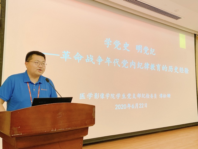 在领学环节,经过前期认真准备,医学影像学院学生党支部纪检委员谭松珊作了题为“革命战争年代党内纪律教育的历史经验”的发言。他分别从建党初期、土地革命战争时期、延安时期三个阶段介绍了革命战争年代中国共产党纪律建设和纪律教育的工作经验、重要事件、重要人物、重要文件等内容。最后,他结合工作实际和岗位交流了学习革命战争年代党内纪律教育的启示:要加强纪律教育,建设纪律文化;要加强制度规范,提高透明度和纪律执行力度;要加强党员管理,提升组织力;领导干部不搞特权,严格守纪执纪。