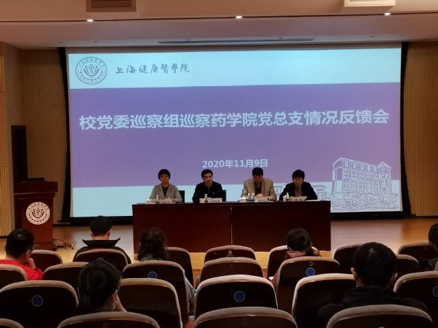 2020年11月9日中午,校党委巡察组巡察药学院党总支情况反馈会在北苑1号楼200人报告厅召开。校党委副书记、纪委书记、党委巡察领导小组副组长、巡察办主任、巡察组组长李明磊,党委巡察领导小组成员、纪委办主任、监察处处长、巡察办副主任、巡察组副组长郑学文和巡察组全体成员出席会议。药学院领导班子成员及师生代表共29人参加了反馈会。会议由药学院党总支副书记、院长徐一新主持。